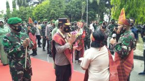 Dalam penyambutan tugas itu, Pangdam dan Ketua Persit KCK I/BB memberikan ulos serta mengalungi bunga kepada Kapolda Sumut bersama Ketua Bhayangkari Daerah Sumut
