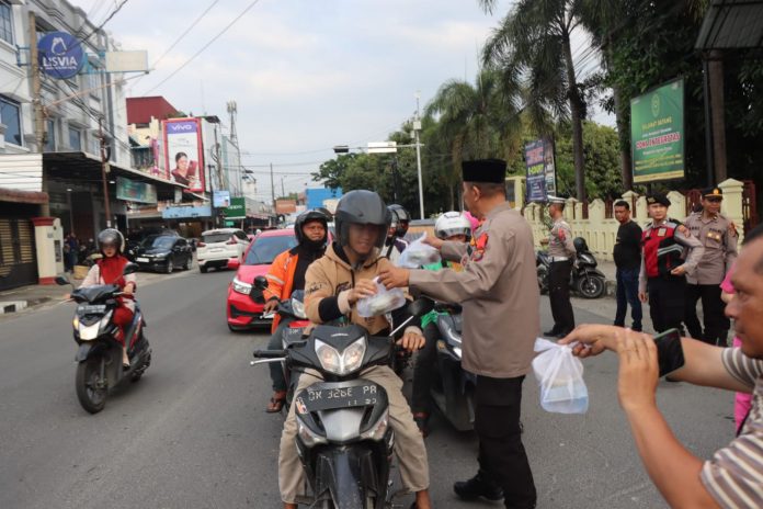 Konspirasi.net | Binjai – Menjelang waktu berbuka puasa, Kasat Binmas AKP Hirlan R. Suprianto dan Kasat Resnarkoba AKP Syamsul Bahri, SE., bersama Bhayangkari dan personil jajaran, menggelar aksi sosial berbagi Takjil wujud kepedulian kepada para warga masyarakat yang melintas depan Mako Polres Binjai. Selasa 25/03/2025 Pkl. 17.00 WIB.