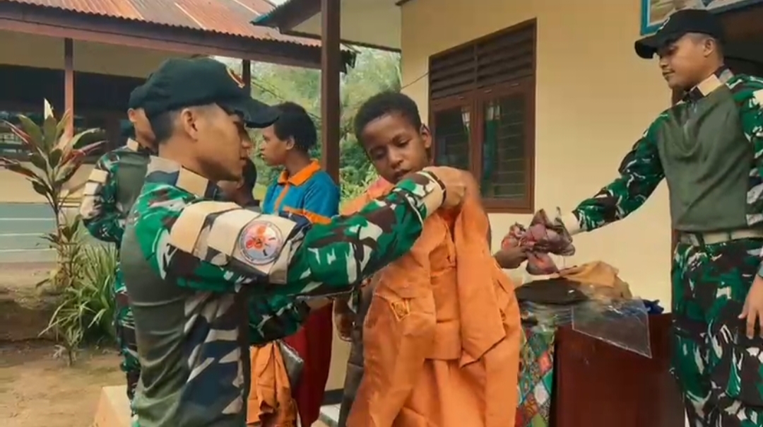 Melalui Pos Bade, para prajurit melaksanakan kegiatan sosial berupa pembagian seragam Pramuka kepada siswa SD Negeri Bade Mememu, Distrik Edera, Kabupaten Mappi, Provinsi Papua Selatan.