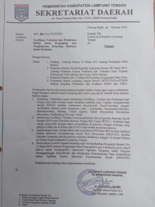 Berdasarkan Undang undang dan aturan tersebut dinsos juga telah bersurat kepada Camat se-Kabupaten Lampung tengah untuk selanjutnya diteruskan ke kampung pada tahun 2019 dan di bulan Februari tahun 2020 ini kami kembali bersurat kepada seluruh Camat se-Kabupaten Lampung Tengah untuk diteruskan kepada seluruh kepala kampung dan kelurahan yang ada di kabupaten Lamteng.