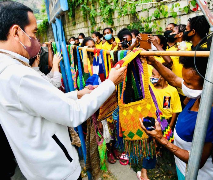“Tas apa ini?” tanya Presiden kepada Paulina Adi, salah seorang mama penjual noken di pinggir Jalan Raya Hawai Sentani, Jayapura, Jumat, 1 Oktober 2021.