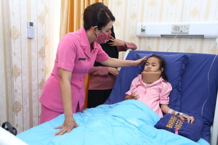 Didampingi Karumkit Bhayangkara TK II Medan Kombes Pol Nelson Situmorang, Ketua Bhayangkari Daerah Sumut Ny. Rita Panca Putra menjenguk Raskita (10) yang telah menjalani operasi bedah plastik oleh tim RS Bhayangkara TK II Medan
