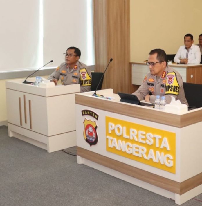 Konspirasi.net | Tangerang – Kapolresta Tangerang Kombes Pol Baktiar Joko Mujiono, S.I.K.,M.M didampingi Wakapolresta Tangerang AKBP Agus Sugiyarso, S.I.K dan KabagOps, dan Penjabat Uta serta para Kapolsek jajaran Polresta Tangerang, di runag Zoom Polresta Tangerang, Senin (27/5/2024).