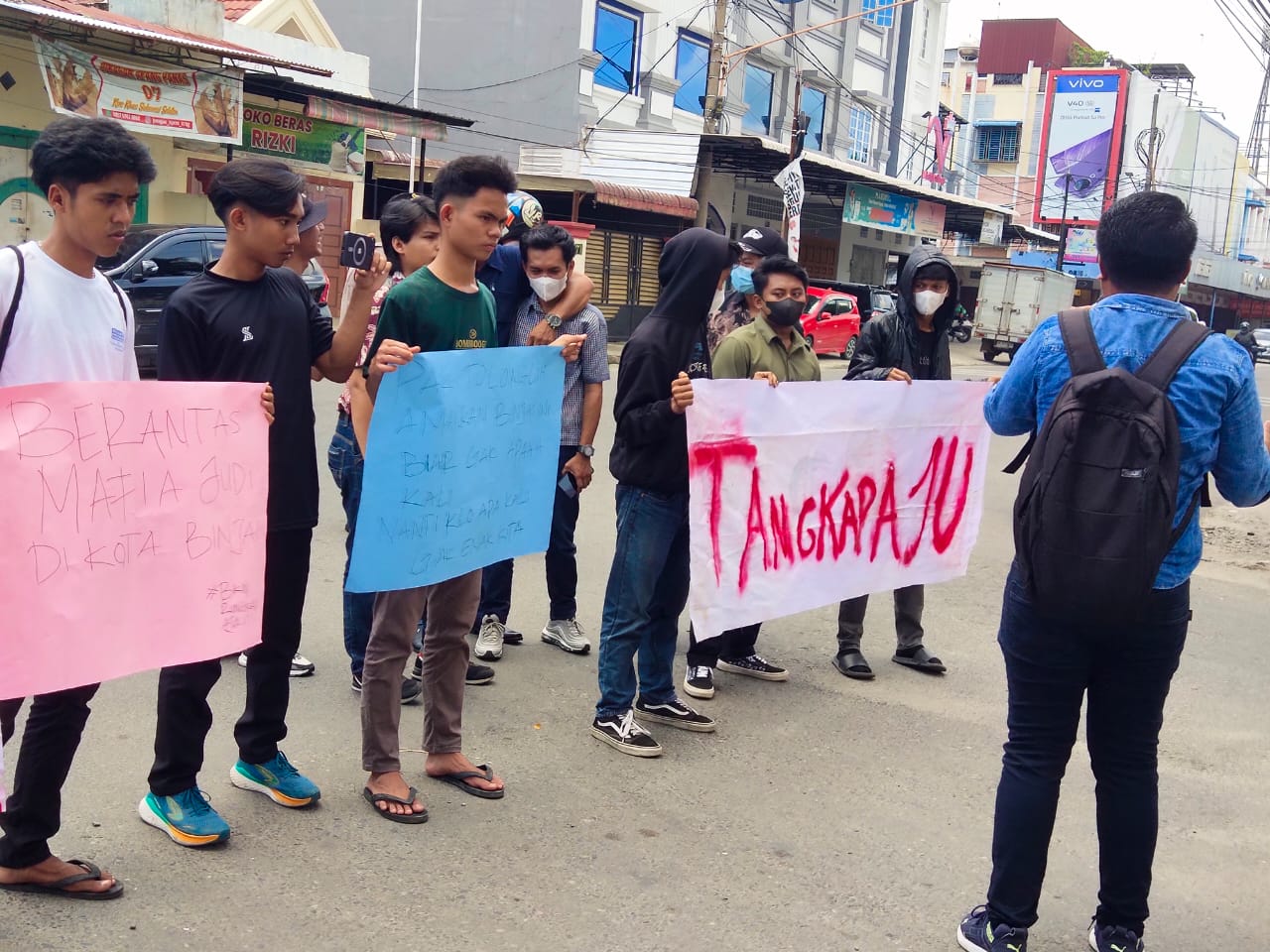Massa meminta agar Kapolres Binjai menutup lokasi-lokasi judi dan segera menangkap Aju.
