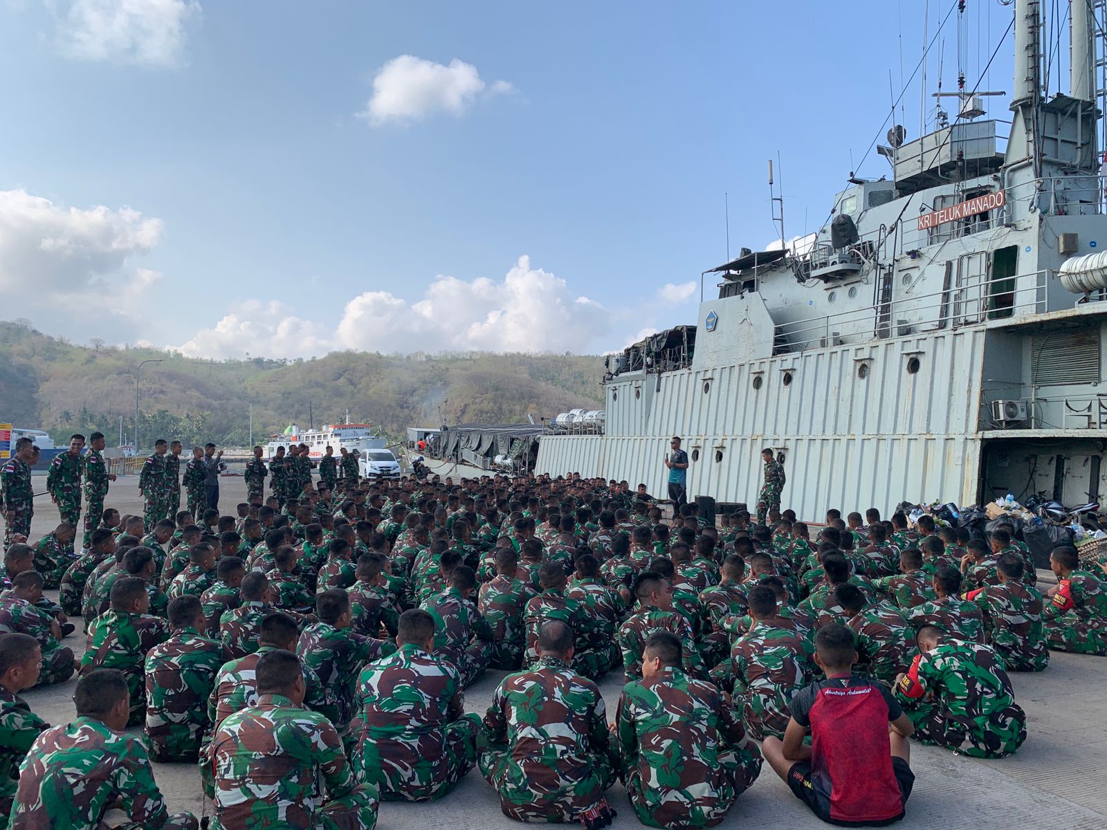 Prajurit Batalyon Kavaleri 6/Naga Karimata yang sedang dalam perjalanan kembali ke Kota Medan singgah di Pelabuhan Gilimas. Selama singgah, para prajurit juga menjaga kebugaran fisik dengan melakukan senam dan tari-tarian tradisional dari Nusa Tenggara Timur.