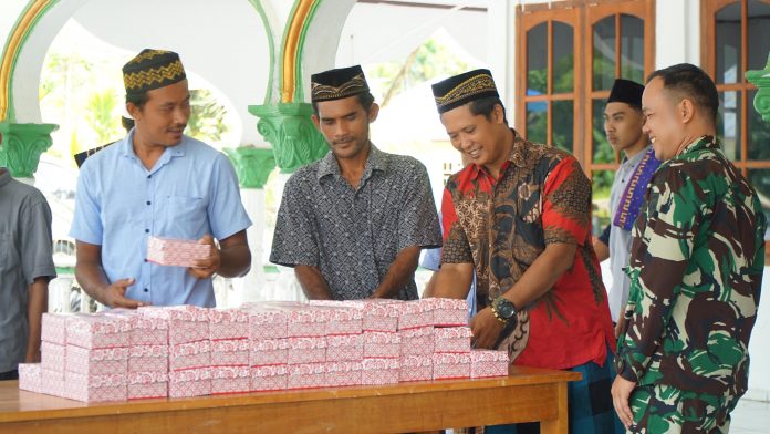 Usai melaksanakan Sholat Jum’at, Personil Satgas Yonif 131/BRS membagikan snack yang sudah disiapkan kepada seluruh jamaah Masjid Miftahul Huda Pir IV.