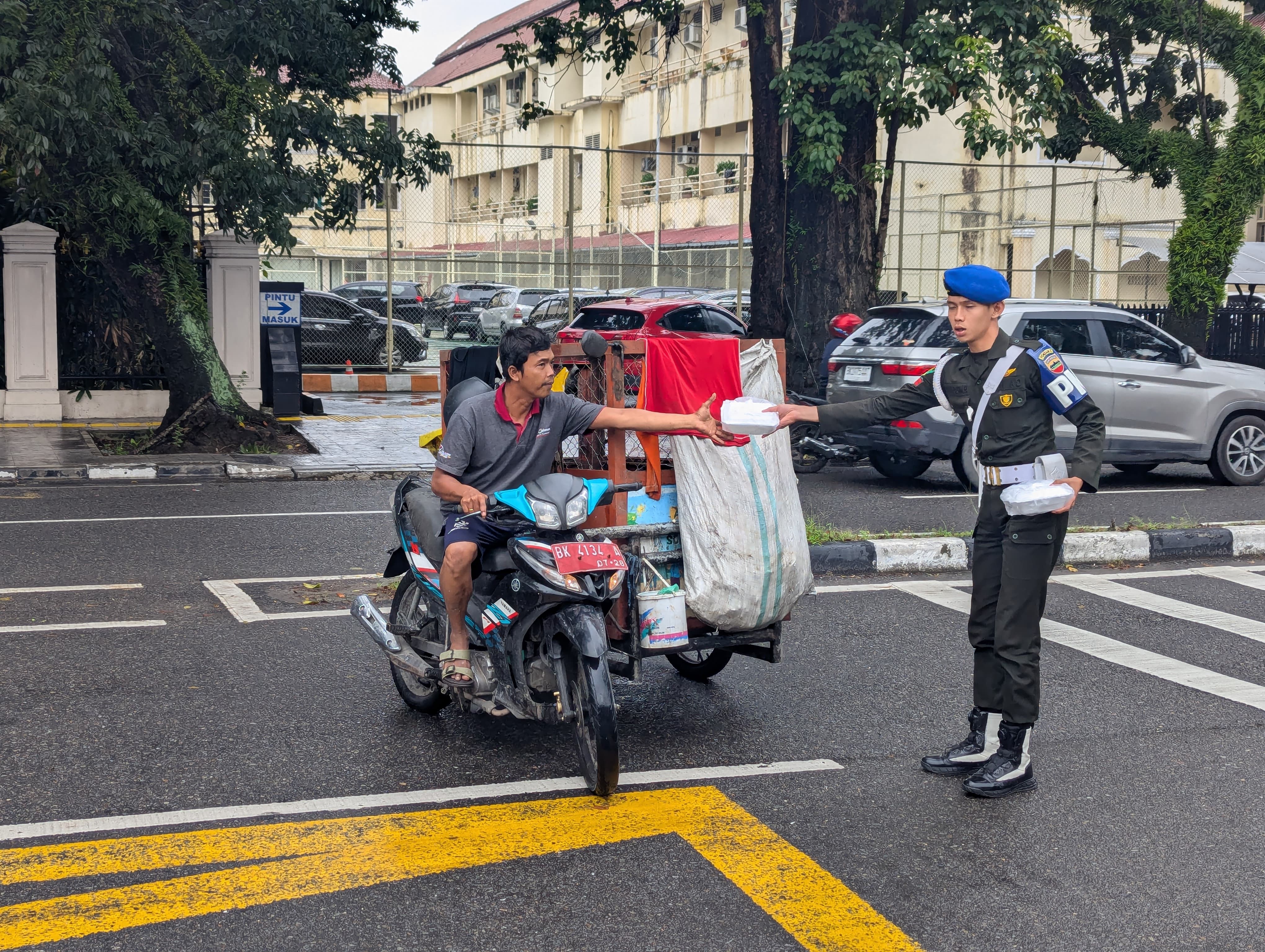 Dalam pembagian rezeki tersebut, Personel Denpom I/5 Medan tampak membagikan panganan kepada setiap pengendara yang melintas didepan kantor. Terlihat pengendara yang melintas merasa senang dengan adanya kegiatan tersebut.