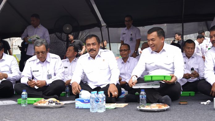 Menteri Imigrasi dan Pemasyarakatan makan siang bersama warga binaan, juga didampingi wakil menteri imigrasi dan Pemasyarakatan, Pimpinan Tinggi dan Ka.UPT Pemasyarakatan. (Tim)