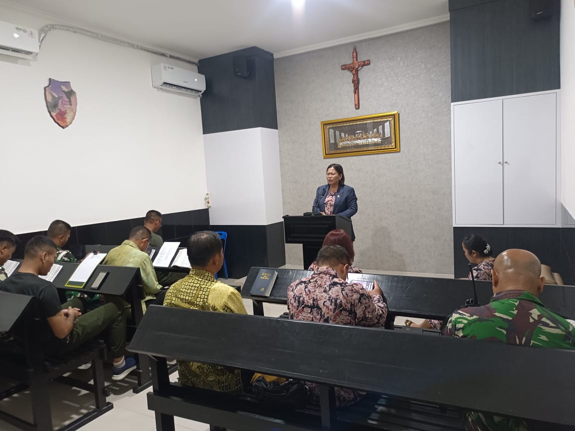 Ibadah yang dilaksanakan dengan khusuk ini dimulai pada pukul 12.40 dan diikuti oleh para personel yang beragama Nasrani, serta dipimpin oleh Pendeta Otomosi Zebua P. Th.