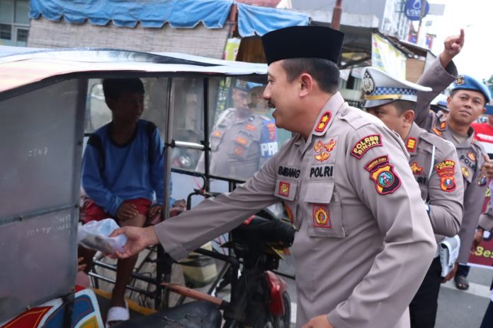 Konspirasi.net | Binjai – Kapolres Binjai Polda Sumatera Utara Akbp Bambang C. Utomo, S.H., S.I.K., M.Si. membagikan takjil untuk berbuka puasa bagi pengguna jalan yang melintasi Mako Polres Binjai , jalan sultan Hasanuddin No.1 Binjai, kota Binjai provinsi Sumatera Utara, Selasa, 11/3/2025.
