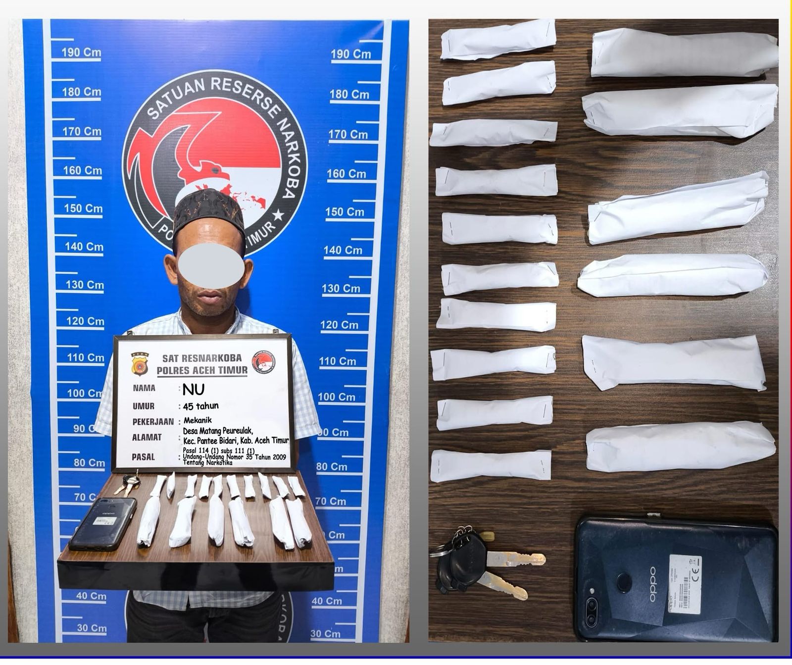 1. Inisial pelaku: NA (50) dan MU (35) warga Desa Keumuneng, Kecamatan Idi Tunong, Kabupaten Aceh Timur. Diamankan pada hari Kamis, (06/03/2025) sekira pukul 00.35 WIB di Desa Keumuneng, Kecamatan Idi Tunong.