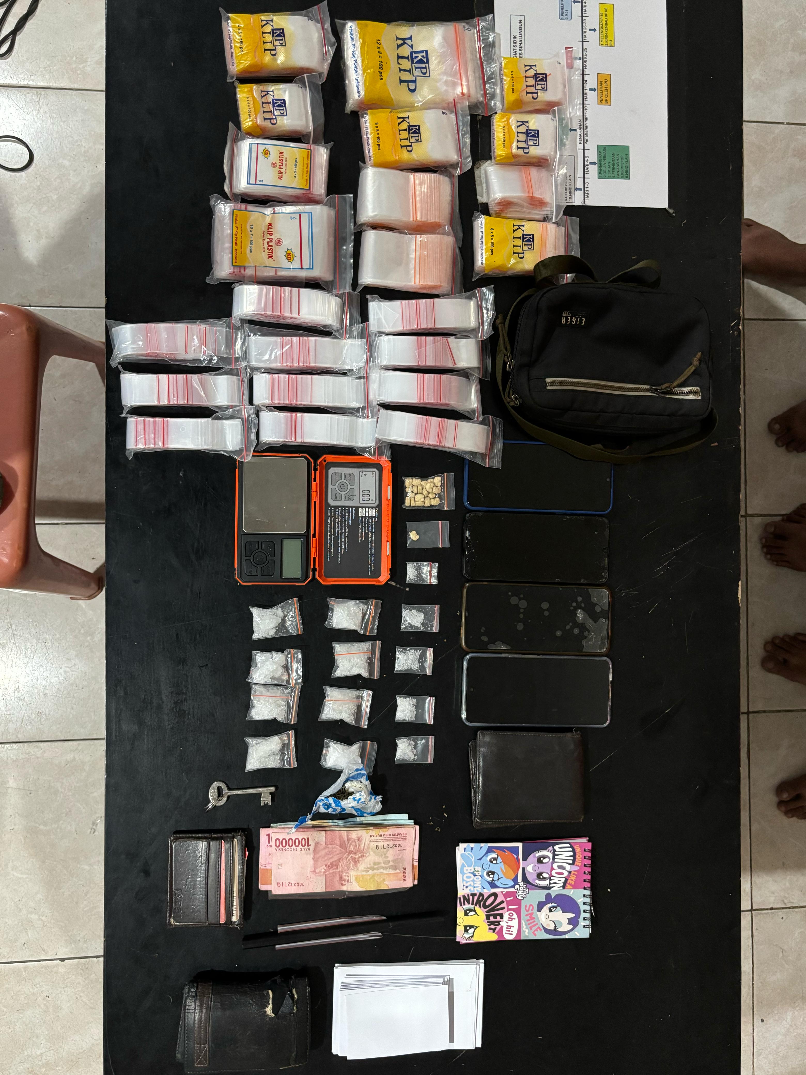 Kasi Humas menambahkan, selain sabu turut diamankan barang bukti lainnya seperti 1 unit Hp Android merk Vivo warna putih, 1 unit Hp Android merk Redmi, 1 unit Hp Android merk Tecno Pova, 1 unit Hp Android merk Vivo warna biru, 1 unit Hp Android merk Vivo warna merah, Uang Tunai Rp 1.100.000, 23 bal plastik klip kosong, 1 buah timbangan digital, 4 buah sekop terbuat dari pipet, 38 lembar amplop, 1 buah buku catatan hasil penjualan, 3 buah dompet, 1 buah tas sandang merk Eiger dan 1 buah kunci Kost.