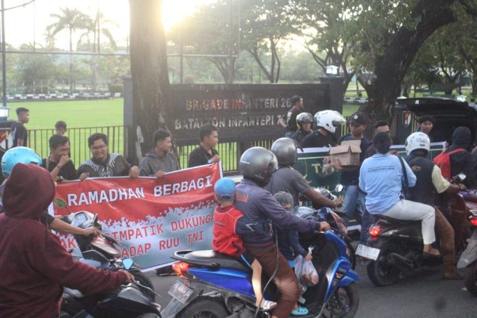 Selain berbagi takjil kepada pengguna jalan, para elemen Masyarakat tersebut yang terdiri dari Komunitas RX King, PSHT (Persaudaraan Setia Hati Teratai) dan Masyarakat Peduli TNI juga membentangkan spanduk berisi pesan dukungan terhadap UU TNI. Beberapa tulisan yang terlihat antara lain “Aksi Simpatik Dukungan Terhadap RUU TNI” dan “RUU TNI Membangun Masa Depan Yang Lebih Baik Untuk Indonesia”. (Tim)