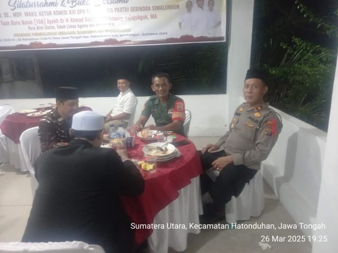 Konspirasi.net | Simalungun, 26 Maret 2025 – Kapolsek Tanah Jawa, Kompol Asmon Bufitra S.H., M.H., mewakili Kapolres Simalungun menghadiri acara silaturahmi dan buka bersama Wakil Ketua Komisi XIII DPR RI dari Fraksi Gerindra, Bapak H. Sugiat Santoso S.E., M.S.P., di Pondok Pesantren Tuan Guru Batak (TGB) Serambi Babussalam Simalungun, Nagori Jawa Tonga, Kecamatan Hatonduhan, Kabupaten Simalungun. Acara yang berlangsung pada Rabu, 26 Maret 2025, pukul 16.00 WIB hingga selesai, dihadiri oleh berbagai tokoh penting, termasuk Wakil Bupati Simalungun, Benny Gusman Sinaga ST, Wakil Walikota Pematangsiantar, Ibu Herlina, dan Pimpinan Pondok Pesantren TGB, Syekh Dr. Ahmad Sabban Elrahmaniy Rajagukguk MA.