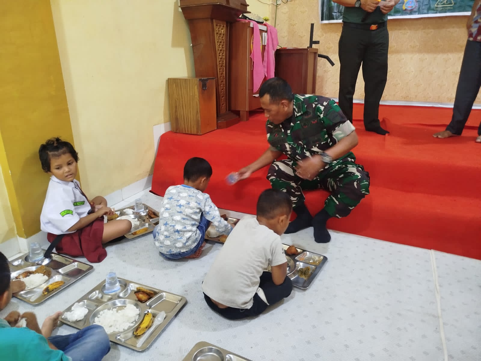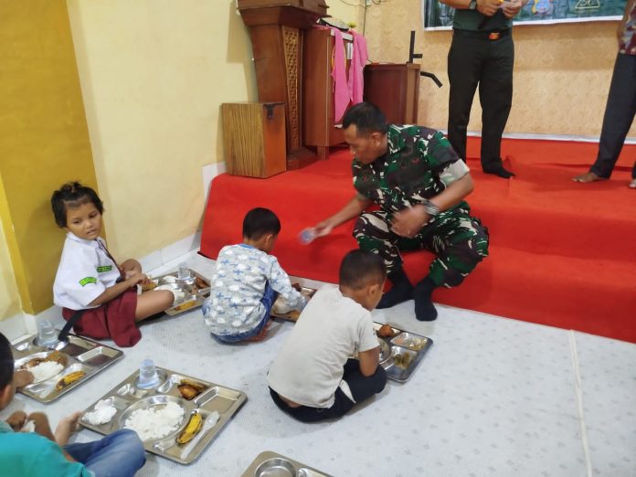 Suasana pembagian paket berlangsung penuh kehangatan. Anak-anak di panti asuhan tampak gembira dan antusias menerima makanan bergizi yang disiapkan langsung oleh prajurit TNI. (Tim)