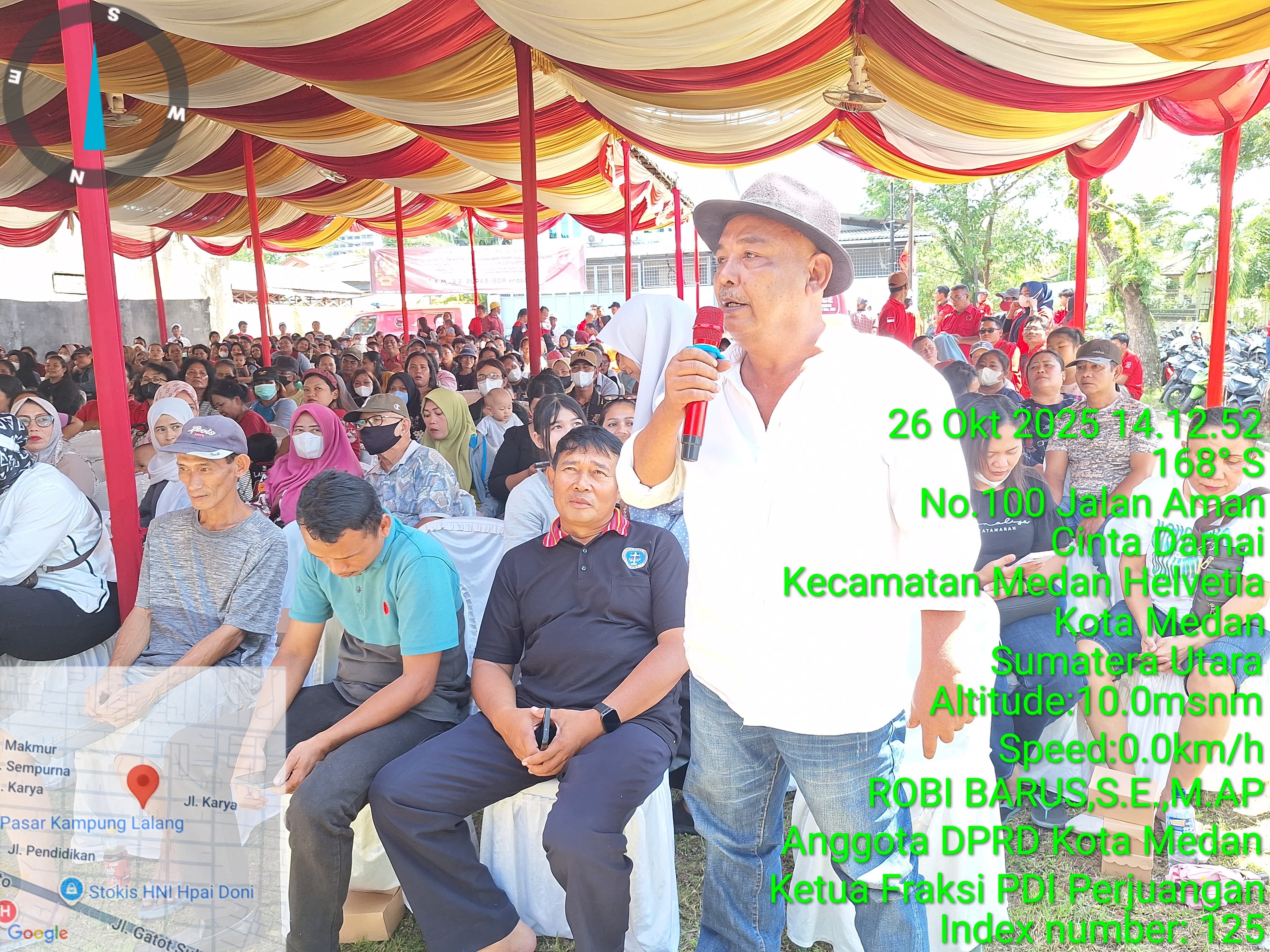 Konspirasi.net | Medan – Anggota DPRD Kota Medan dari Dapil I Medan Robi Barus S.E M.A.P kembali melakukan Sosper didaerah pemilihannya, kali ini Sosper tersebut dilaksanakan di Jalan Aman Lingkungan 4 Kelurahan Cinta Damai Kecamatan Medan Helvetia. Minggu (26/10/2025).